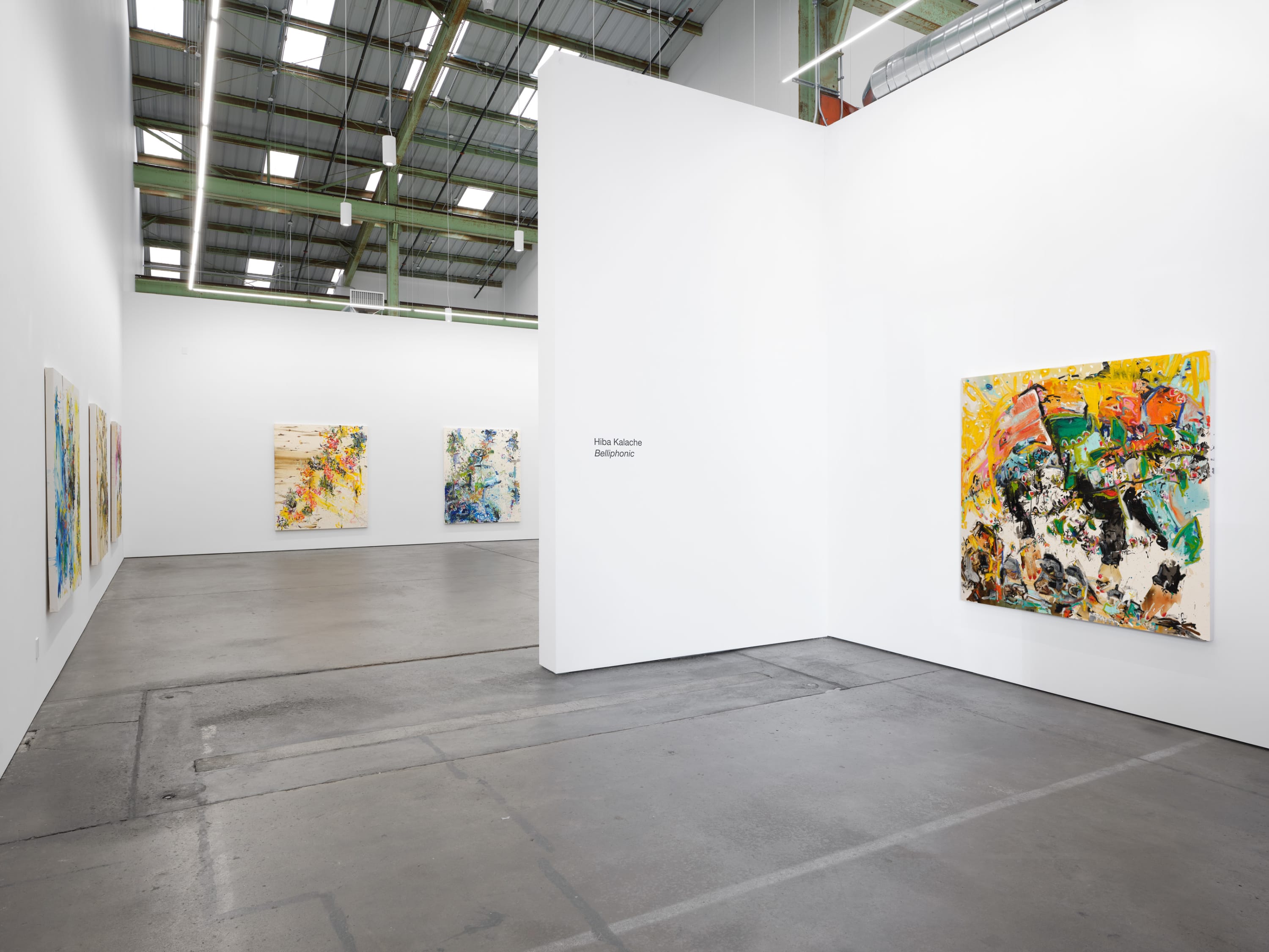 The exhibition title, ‘belliphonic,’ comes from Martin Daughtry’s term referring to the vast array of sounds that are created by conflict; not only weaponry, but motorized vehicles, sirens, generators, even the propaganda that fills the air in the wake of an insurrection. Kalache’s body carries these sounds just as she has carried new life in her womb. Something of the belliphonic is translated through the act of painting, the memory of a sound inflecting her hand. But there is also a refusal to submit, to collapse in the wake of tragedy.